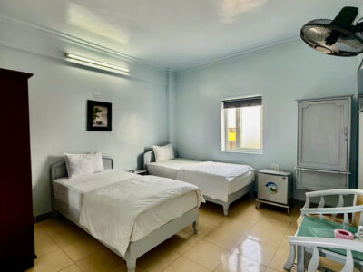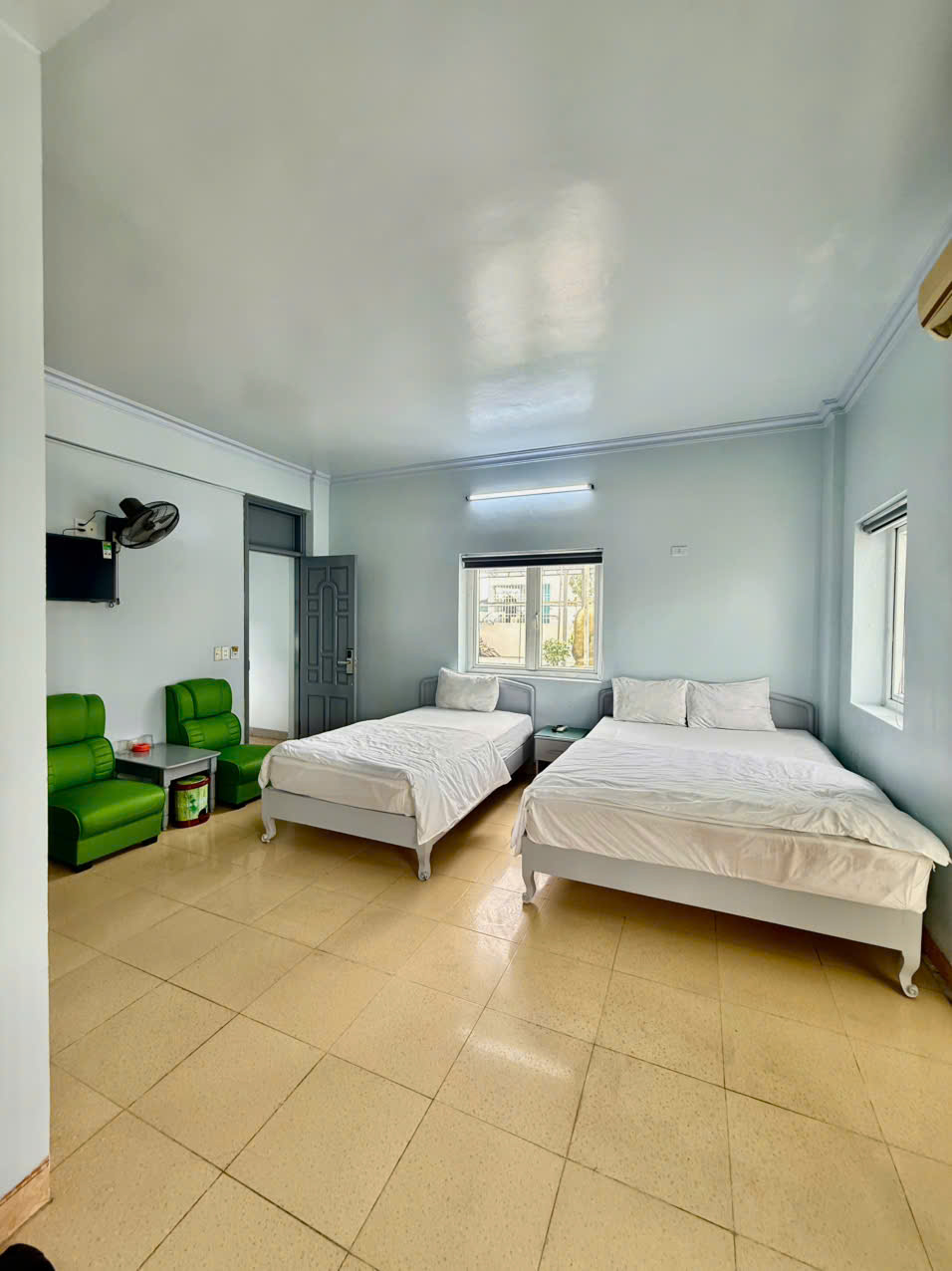 Phòng rộng rãi, thoáng mát với nhiều cửa sổ đón ánh sáng tự nhiên và hướng nhìn ra phía trước sân khách sạn, mang lại cảm giác thư giãn và dễ chịu.